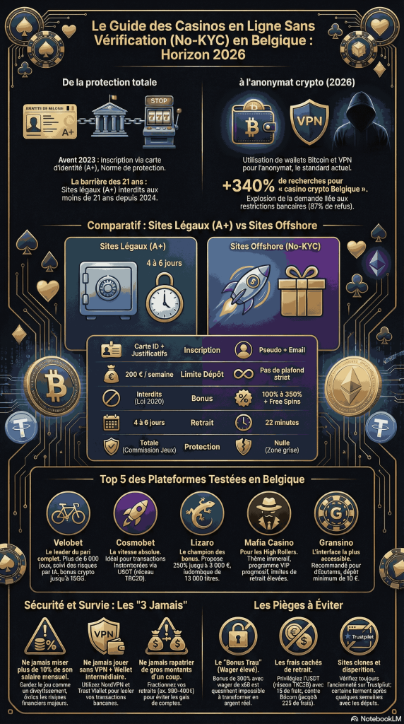 Jouer anonymement, déposer en crypto, encaisser en 15 minutes – les plateformes sans KYC explosent chez les joueurs belges fatigués des vérifications interminables. En 2026 ces sites crypto-friendly permettent de parier avec juste un pseudo et un wallet Bitcoin. Pas de scan de carte d’identité, pas d’attente de 72 heures. Le hic ? Ils opèrent hors licence A+ belge, donc zéro recours légal si ça tourne mal.