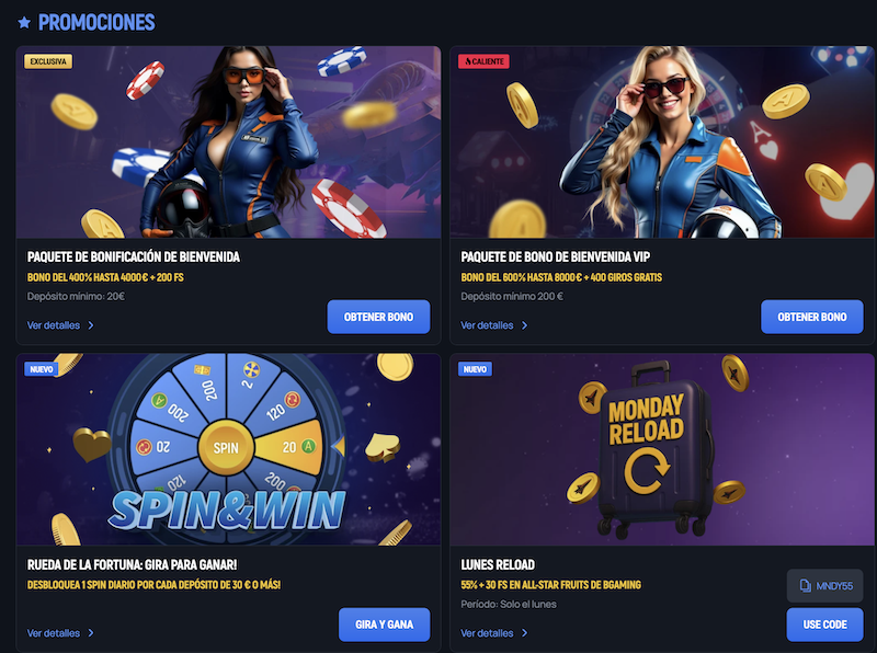 Especializado en jugadores que valoran la velocidad, Velobet procesa el 95% de los retiros en menos de 10 minutos. Su tecnología blockchain permite verificar cada transacción en tiempo real. Con más de 5.000 slots, 200 juegos de mesa y 80 opciones en vivo, ofrece diversidad sin sacrificar calidad. Su bono sin depósito de 25€ más 50 giros gratis permite probar la plataforma sin riesgo inicial. Los usuarios españoles representan el 18% de su base, convirtiéndolo en uno de los casinos fuera de España más populares.