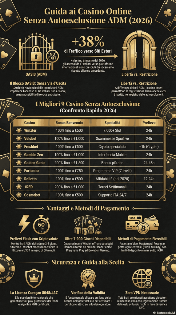 Nel 2026 il panorama del gioco online in Italia è cambiato radicalmente. Migliaia di giocatori italiani che si sono ritrovati bloccati dal sistema ADM cercano alternative concrete per tornare a giocare. La risposta? Piattaforme estere con licenze internazionali riconosciute — Curaçao, Malta, Gibilterra — che non aderiscono al registro OASIS e permettono di registrarsi liberamente. Non stiamo parlando di siti improvvisati, ragazzi: parliamo di operatori con milioni di utenti attivi, valutazioni Trustpilot verificabili e prelievi che arrivano in meno di 24 ore. I casino non legati al blocco ADM rappresentano ormai una fetta enorme del mercato italiano: secondo le stime di settore, nel primo trimestre 2026 il traffico da IP italiani verso queste piattaforme è cresciuto del 38% rispetto allo stesso periodo del 2025. Ecco i 9 migliori nel 2026.